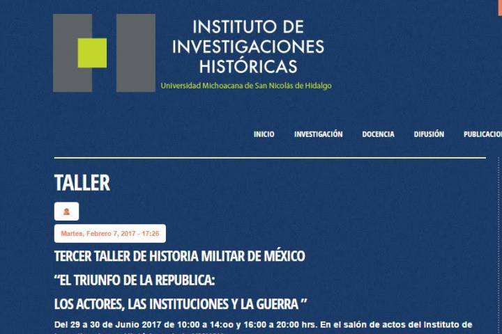 NOTICIAS 26/05/2017Instituto de Investigaciones Históricas invita al 3er Taller sobre "El Triunfo de la República"El Instituto de Investigaciones Históricas de la Universidad Michoacana de San Nicolás de Hidalgo y el Cuerpo Académico de Tecnología e Historia Militar de México, convocan al Tercer Taller de Historia Militar de México denominado: "El Triunfo de la República: los actores, las instituciones y la guerra" que se celebrará del 29 al 30 de junio del presente año.