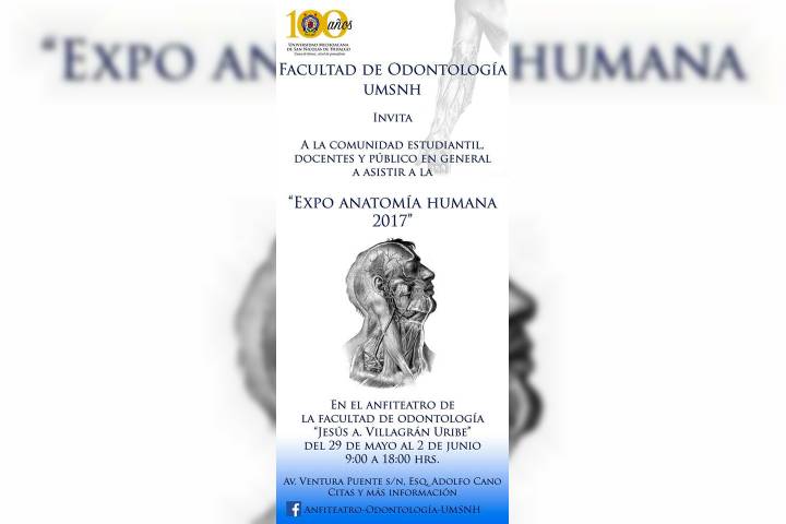 NOTICIAS 27/05/2017Expo Anatomía Humana 2017 en Facultad de Odontología de la UMSNHLa Universidad Michoacana de San Nicolás de Hidalgo, a través de su Facultad de Odontología invita a estudiantes y público en general a visitar la exposición sobre Anatomía Humana 2017, coordinada por el catedrático Arturo Velazco López, en el Anfiteatro de la Facultad "Jesús A. Villagrán Uribe".