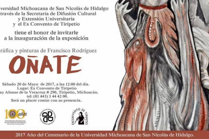 NOTICIAS 18/05/2017Ex Convento de Tiripetío albergara obra de Francisco Rodríguez OñatePara continuar con las actividades de promoción y difusión de la cultura en el año de su centenario, la Universidad Michoacana de San Nicolás de Hidalgo a través de la Secretaría de Difusión Cultural y Extensión Universitaria y el Ex Convento de Tiripetío invitan a la inauguración de la exposición del artista michoacano Francisco Rodríguez Oñate.