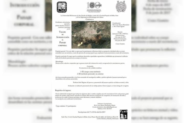 La Universidad Michoacana de San Nicolás de Hidalgo, a través de la Facultad Popular de Bellas Artes y el Tercer Diplomado de MetodologÃa de la Danza, abren la convocatoria para participar en el Taller de introducción al paisaje corporal.