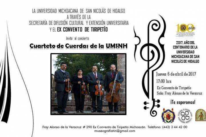 La Universidad Michoacana de San Nicolás de Hidalgo, a través de la Secretaría de Difusión Cultural y Extensión Universitaria y el Ex Convento de Tiripetío, invita al concierto que ofrecerá el Cuarteto de Cuerdas de la Universidad Michoacana.