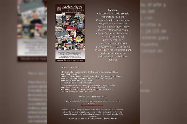 NOTICIAS 19/03/2017La revista nicolaita Archipiélago de Canteras recibe artículosLa Revista Archipiélago de Canteras, editada por la Universidad Michoacana de San Nicolás de Hidalgo convoca a la comunidad de la Escuela Preparatoria "Melchor Ocampo" y a los universitarios en general, a expresar su opinión o inquietudes sobre asuntos relacionados con la educación, la ciencia, el arte y otras disciplinas del pensamiento.