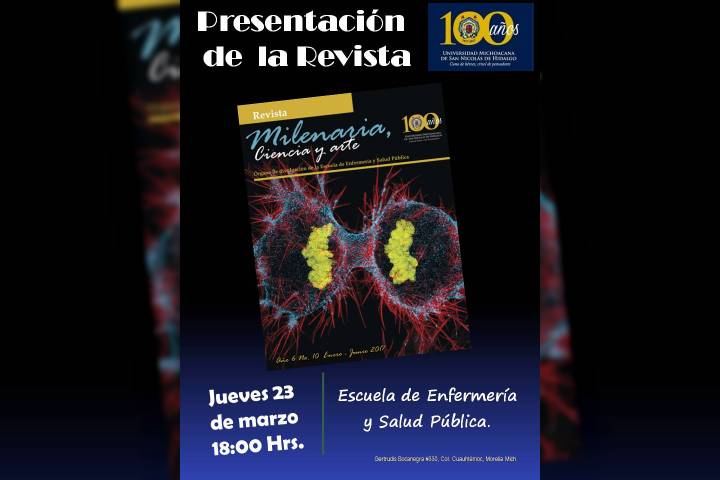 NOTICIAS 19/03/2017Se acerca presentación de la Revista MilenariaLa Escuela de Enfermería y Salud Pública de la Universidad Michoacana de San Nicolás de Hidalgo invita a la comunidad nicolaita y público en general a la presentación de la revista Milenaria, Ciencia y Arte, que tendrá lugar el próximo jueves 23 de marzo a las 18 horas en las instalaciones de dicha dependencia universitaria.