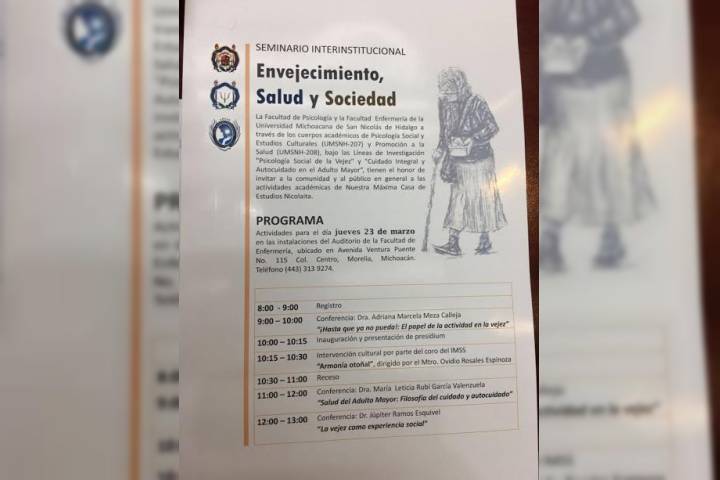 NOTICIAS 22/03/2017Envejecimiento, salud y sociedad, tema de análisis en la UMSNHLa Universidad Michoacana de San Nicolás de Hidalgo, a través de la Facultad de Psicología y la Facultad de Enfermería invitan a la comunidad universitaria y al público en general, a las actividades académicas que se llevarán a cabo como parte del Seminario Interinstitucional "Envejecimiento salud y sociedad".