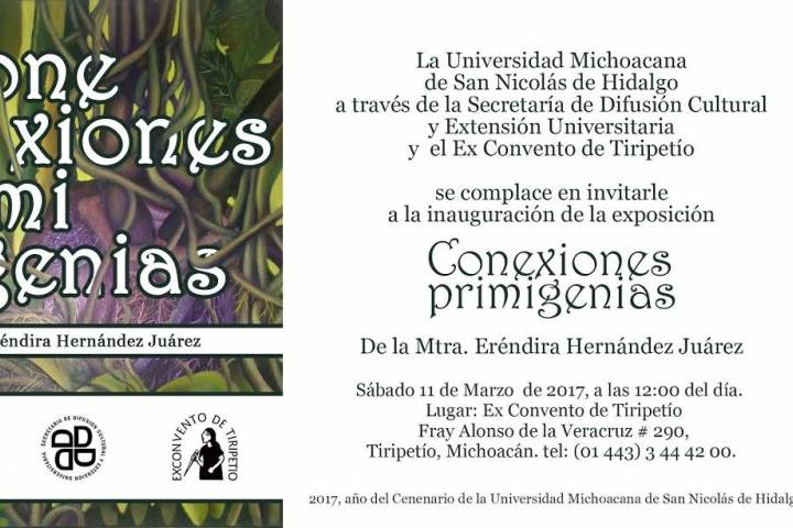 NOTICIAS 09/03/2017Próximo sábado estrena exposición Ex Convento de TiripetíoLa Universidad Michoacana de San Nicolás de Hidalgo a través de la Secretaría de Difusión Cultural y Extensión Universitaria y el Ex Convento de Tiripetío, invitan a la comunidad nicolaita y público en general a la inauguración de la exposición "Conexiones Primigenias" de la maestra Eréndira Hernández Juárez.