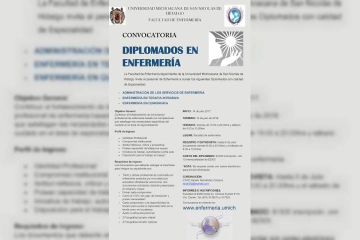 La Facultad de Enfermería dependiente de la Universidad Michoacana de San Nicolás de Hidalgo, invita al personal de Enfermería a cursar los diplomados con calidad de especialidad en las áreas de Administración de los Servicios de Enfermería; Enfermería en Terapia Intensiva y Enfermería en Quirúrgica.