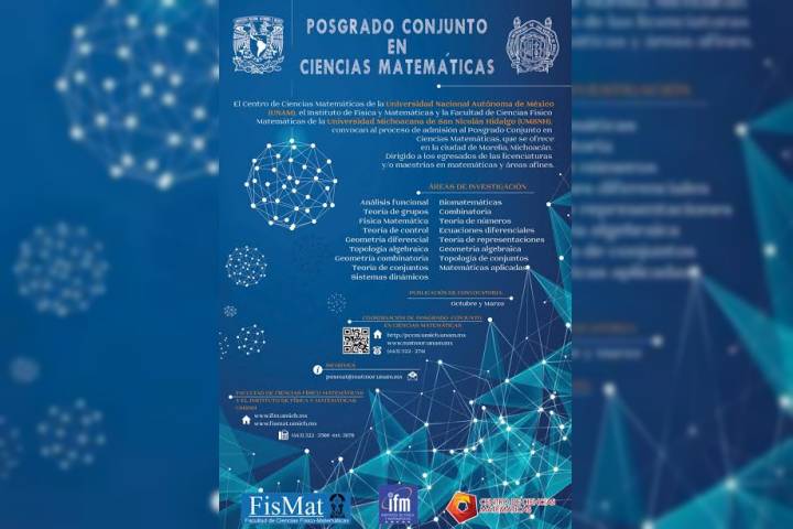 El Centro de Ciencias Matemáticas de la Universidad Nacional Autónoma de México, la Facultad de Ciencias Físico-Matemáticas y el Instituto de Física y Matemáticas de la Universidad Michoacana de San Nicolás de Hidalgo, ofrecen doctorado interinstitucional en Ciencias Matemáticas con dos fechas de anuales de admisión.