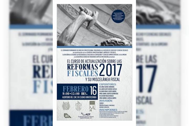 El Seminario Permanente de Derecho Constitucional Tributario de la Facultad de Derecho y Ciencias Sociales, en coordinación con su Centro de Investigaciones Jurídicas y Sociales y la División de Estudios de Posgrado de la Facultad de Contaduría y Ciencias Administrativas de la Casa de Hidalgo, invita al Curso de Actualización sobre las Reformas Fiscales 2017 y su Miscelánea Fiscal.