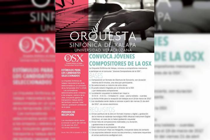 Con la finalidad de crear un espacio de difusión a jóvenes compositores mexicanos, la Orquesta Sinfónica de Xalapa (OSX) de la Universidad Veracruzana, organiza un concurso dirigido a reafirmar el talento de los alumnos que estudian Música a través de la convocatoria Jóvenes Compositores Mexicanos de la OSX.