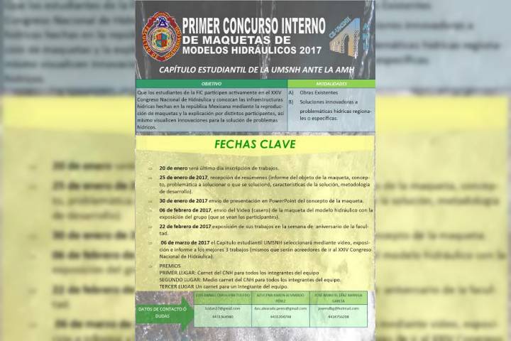 Con el propósito de que sus estudiantes conozcan las infraestructuras hidráulicas existentes en el país mediante la reproducción de maquetas, así como que visualicen innovaciones para la solución de problemas hídricos, la Facultad de Ingeniería Civil (FIC) de la Universidad Michoacana de San Nicolás de Hidalgo (UMSNH) invita a la comunidad estudiantil, a participar en el Primer Concurso Interno de Maquetas de Modelos Hidráulicos.