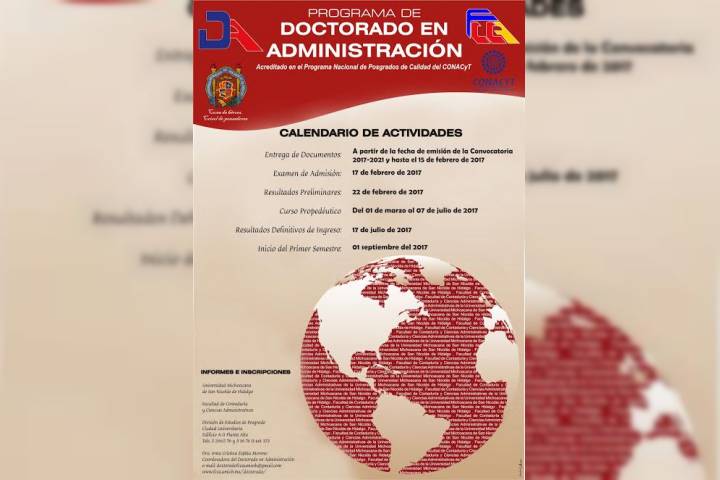La Facultad de Contaduría y Ciencias Administrativas, a través de su División de Estudios de Posgrado, invita a los profesionales en las áreas administrativas, a participar en el proceso de selección para el próximo Doctorado en Administración que inicia en el mes de septiembre del próximo año.