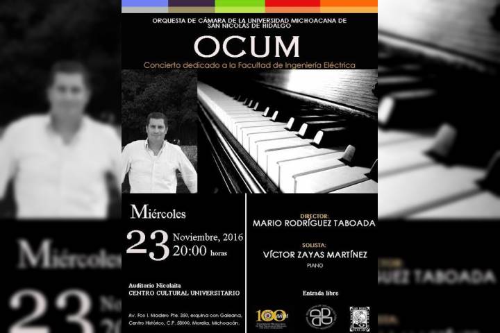La Secretaría de Difusión Cultural y Extensión Universitaria, a través de la Orquesta de Cámara de la Universidad Michoacana (OCUM), invita al concierto dentro del Programa "Vive el Centenario con la OCUM", que se llevará a cabo este miércoles 23 de noviembre, en esta ocasión dedicado a la Facultad de Ingeniería Eléctrica.