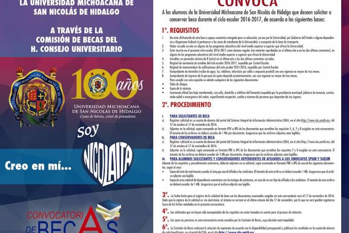 La Universidad Michoacana de San Nicolás de Hidalgo, a través su Sistema Integral de Información Administrativa, informa que está vigente el periodo para renovar o solicitar la beca que otorga anualmente la Casa de Hidalgo a alumnos y sindicalizados para el ciclo escolar 2016-2017.