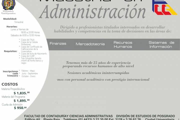 La Universidad Michoacana de San Nicolás de Hidalgo, a través de la División de Estudios de Posgrado de la Facultad de Contaduría y Ciencias Administrativas (FCCA), convoca a los profesionistas titulados en el área, a ingresar al programa de Maestría en Administración.