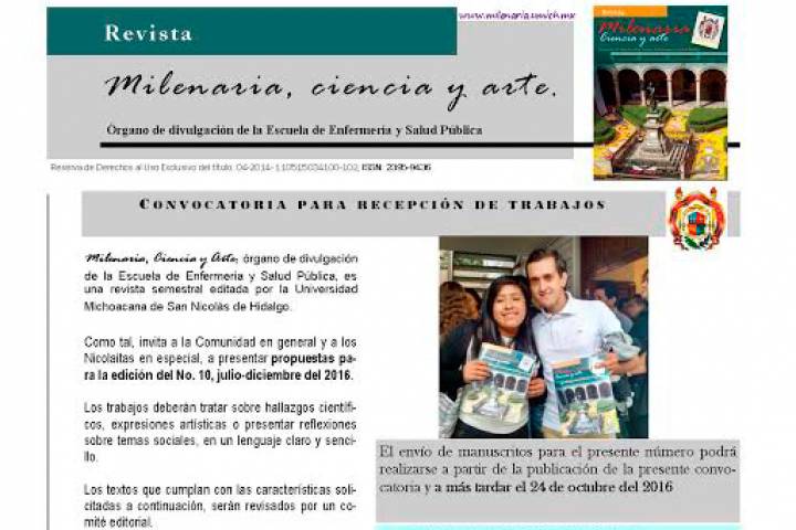 La Universidad Michoacana de San Nicolás de Hidalgo, a través de la Escuela de Enfermería y Salud Pública, dio a conocer la convocatoria para participar en la publicación de la edición número 10 julio-diciembre de 2016, para la Revista Milenaria Ciencia y Arte.