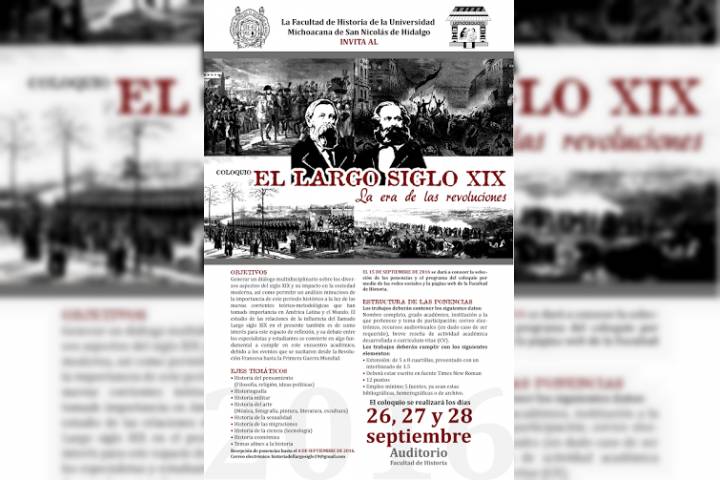 Con el propósito de generar un diálogo multidisciplinario sobre los diversos aspectos del siglo XIX y su impacto en la sociedad moderna, así como permitir un análisis minucioso de la importancia de este periodo histórico a la luz de las nuevas corrientes que han tomado importancia en América Latina y el mundo, la Facultad de Historia de la Universidad Michoacana de San Nicolás de Hidalgo (UMSNH), invita a los interesados a participar en ... Ver más...