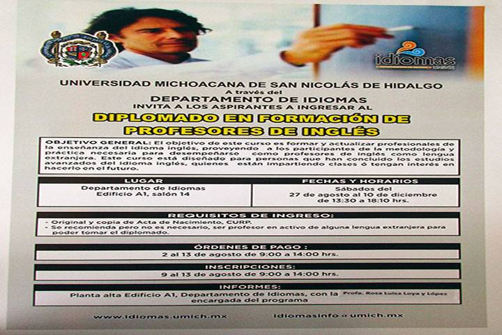 NOTICIAS 02/08/2016UMSNH ofrece Diplomado para Profesores de InglésPara coadyuvar a la actualización curricular de profesores del idioma inglés, y proporcionar a los participantes la metodología y práctica necesaria para desempeñarse como docentes de este idioma como lengua extranjera, la Universidad Michoacana de San Nicolás de Hidalgo, a través de su Departamento de Idiomas, invita a los interesados a ingresar al Diplomado en Formación de Profesores de Inglés, para el periodo de agosto a diciembre 201... Ver más...