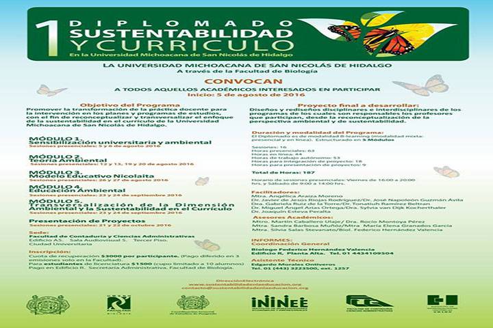 Para promover la transformación de la práctica docente en la intervención en los planes y programas de estudios, con el fin de reconceptualizar y transversalizar el enfoque de la sustentabilidad en los programas de estudio de la Casa de Hidalgo, la Universidad Michoacana de San Nicolás de Hidalgo (UMSNH), convoca a todos aquellos académicos interesados en participar en el "Diplomado Sustentabilidad y Currículum en la UMSNH".