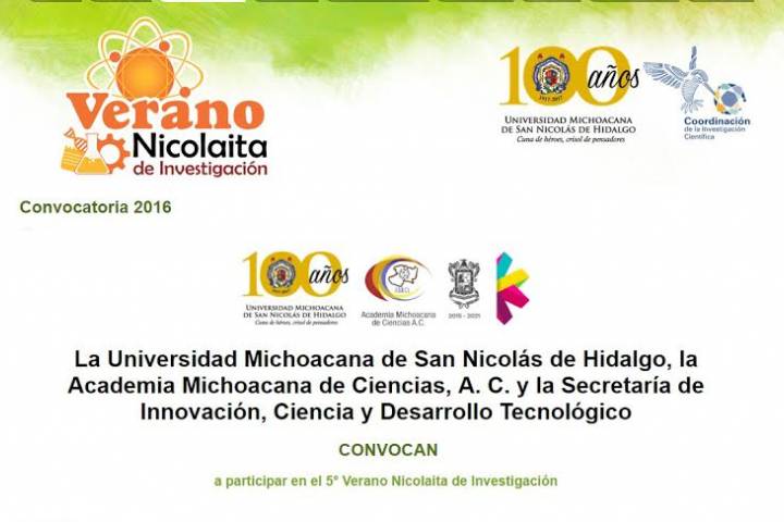 NOTICIAS 02/06/2016Invitan a estudiantes a participar en el 5º Verano Nicolaita de InvestigaciónCon el objetivo de fomentar el interés de los estudiantes de licenciatura para participar en proyectos de investigación a cargo de investigadores adscritos a instituciones de nivel superior del Estado, la Universidad Michoacana de San Nicolás de Hidalgo, en conjunto con la Academia Michoacana de Ciencias y la SecretarÃa de Innovación, Ciencia y Desarrollo Tecnológico, invitan a participar en el 5° Verano Nicolaita de Investigación.