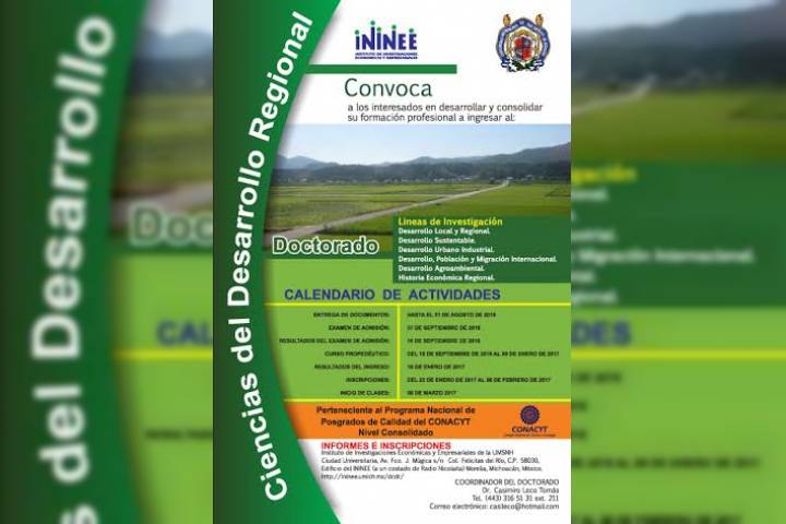 NOTICIAS 06/06/2016UMSNH abre convocatoria doctorado en ciencias de Desarrollo RegionalEl Instituto de Investigaciones Económicas y Empresariales (ININEE) de la Universidad Michoacana de San Nicolás de Hidalgo abrió su proceso de inscripción para ingresar al Doctorado en Ciencias del Desarrollo Regional, programa dirigido a quienes cuentan con el grado de maestrÃa en ciencias económicas, administrativas o sociales entre ellas: EconomÃa, Administración, Historia, Desarrollo Regional, Desarrollo Rural, Problemas Agropecuarios... Ver más...