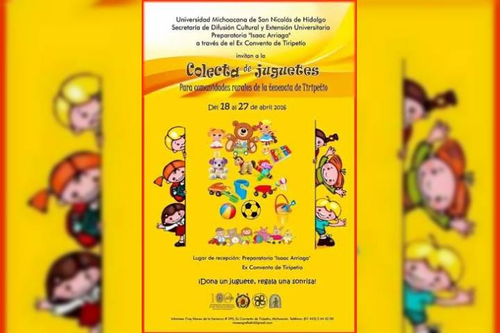 NOTICIAS 26/04/2016Colecta de juguetes para pequeños de la tenencia de TiripetíoComo parte del espíritu humanista y de responsabilidad social que caracterizan a la Casa de Hidalgo, la Secretaría de Difusión Cultural y Extensión Universitaria, a través del Exconvento de Tiripetío, organizan una colecta de juguetes con motivo del Día del Niño, para los pequeños que viven en la comunidad rural de dicha tenencia.