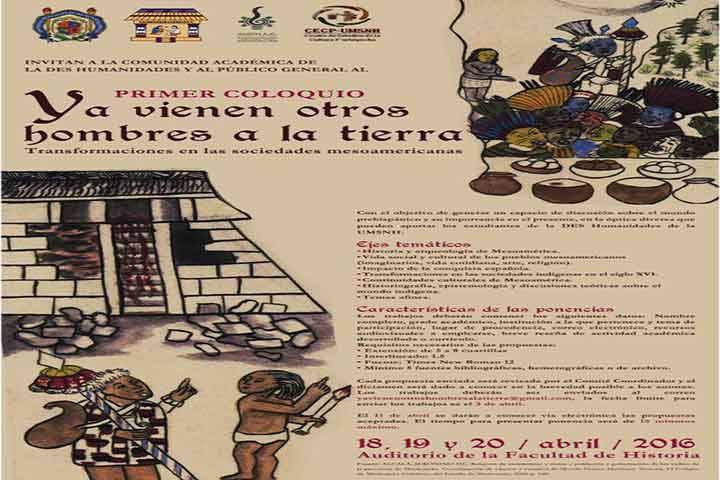 La Universidad Michoacana de San Nicolás de Hidalgo a través de su Facultad de Historia invita a profesores, investigadores y alumnos de la DES de Humanidades, así como al público en general, a participar en el Primer Coloquio "Ya vienen otros hombres a la Tierra, transformaciones en las sociedades mesoamericanas", a realizarse a mediados de abril en el auditorio de la institución.