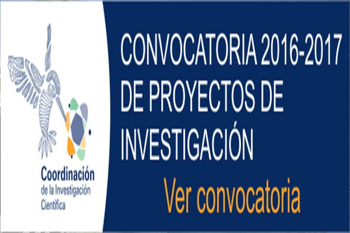 NOTICIAS 29/01/2016Abierta convocatoria investigadores nicolaitas para proyectos 2016 - 2017Con el propósito de promover y apoyar los proyectos de investigación que se realizan al interior de la Universidad Michoacana, el Consejo de la Investigación Científica de la Casa de Hidalgo invita a los Profesores Investigadores de tiempo completo adscritos a los Institutos, Facultades, Escuelas y Unidades Profesionales, a presentar sus proyectos para participar en la Convocatoria 2016-2017 de Proyectos de Investigación.