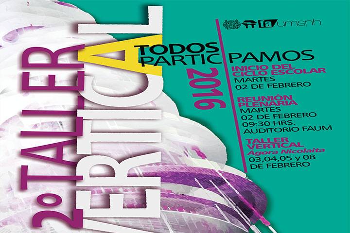 La Facultad de Arquitectura de la Universidad Michoacana de San Nicolás de Hidalgo (UMSNH), abrirá su Segundo Taller Vertical del presente ciclo escolar con la realización de tres eventos importantes que marcan el inicio del próximo semestre, entre los cuales destaca la explicación del Taller Vertical para alumnos y docentes, que en esta ocasión llevará como temática el diseño del Ágora Nicolaita.