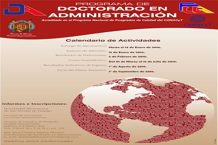 NOTICIAS 16/12/2015Doctorado en Ciencias Administrativas, ofrece UMSNHLa Facultad de Contaduría y Ciencias Administrativas de la Universidad Michoacana de San Nicolás de Hidalgo (FCCA), continúa con el proceso de inscripción para su Programa de Doctorado en Administración, abierto a todos los candidatos provenientes de cualquier institución de educación superior nacional o extranjera que cubran con los conocimientos y demás requisitos establecidos en la convocatoria.