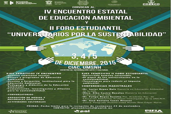 Con el objetivo de reunir a los expertos (educadores, promotores y comunicadores) en el campo de la Educación Ambiental del estado de Michoacán, para un intercambio de experiencias, metodologías y propuestas que contribuyan al fortalecimiento del cuidado del medio ambiente en los diferentes espacios sociales, la Universidad Michoacana de San Nicolás de Hidalgo (UMSNH), albergará el IV Encuentro Estatal de Educación Ambiental y el II Foro ... Ver más...
