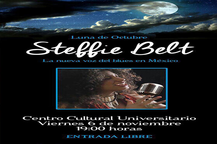 NOTICIAS 31/10/2015Concierto de Steffie Beltt en la UMSNHCon la finalidad de presentar su disco Luna de Octubre, la cantautora México-cubana, Steffie Beltt, se presentará en el Centro Cultural Universitario, con un concierto en donde el blues será el platillo a degustar.