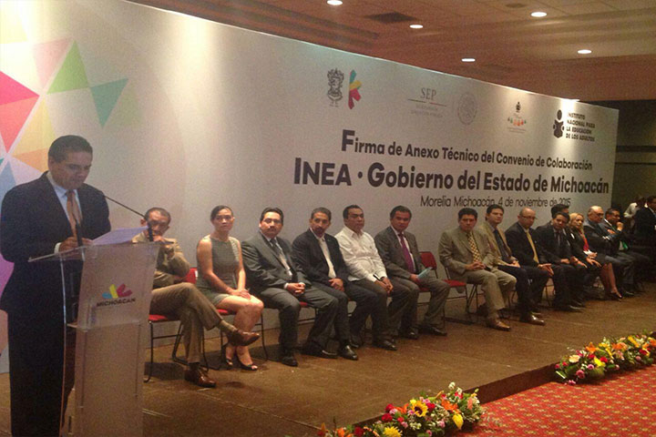 El rector de la Universidad Michoacana de San Nicolás de Hidalgo, Medardo Serna González, atestiguó la firma del Convenio de Colaboración entre el Instituto Nacional para la Educación de los Adultos (INEA) y el Gobierno de Michoacán, que fortalece el programa para abatir el rezago educativo en el Estado.