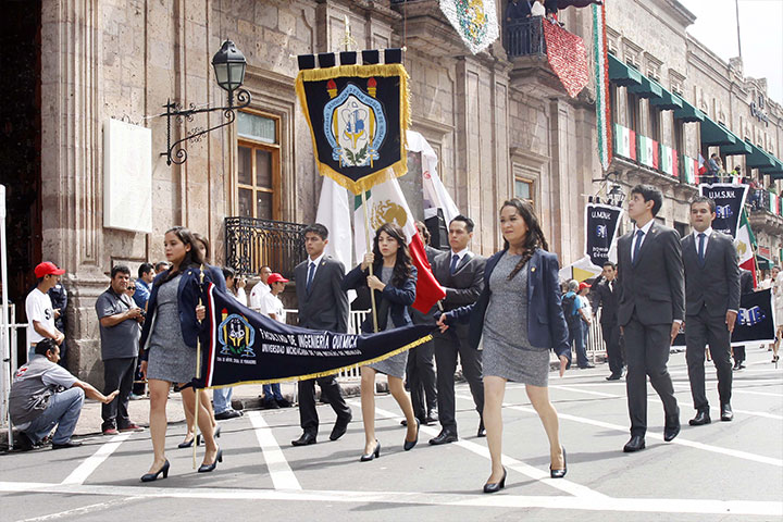 Encabezada por la escolta del Colegio Primitivo y Nacional de San Nicolás de Hidalgo y la multigalardonada Banda de Guerra, la Universidad Michoacana engalanó con su participación el desfile realizado en la capital michoacana para recordar el CCV aniversario del Inicio de la Lucha de Independencia.