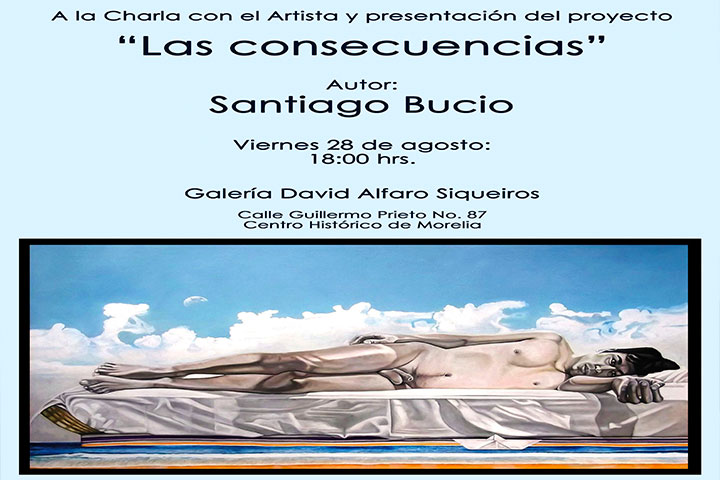 NOTICIAS 27/08/2015Charla con Santiago Bucio en la FPBALuego de un año de investigación en un proyecto de Artes Plásticas, denominado "Las Consecuencias", Santiago Bucio Carrillo, profesor investigador de la Facultad Popular de Bellas Artes de la Universidad Michoacana de San Nicolás de Hidalgo, presentará 15 piezas en la Galería David Alfaro Siqueiros, de la propia institución, exponiendo mediante el diálogo con el público, el proceso de conformación de esta colección.