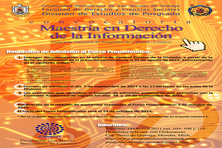 Este lunes 31 cierra la convocatoria para participar en el proceso de admisión al Programa de Maestría en Derecho de la Información, que ofrece la Universidad Michoacana de San Nicolás de Hidalgo (UMSNH), a través de la División de Estudios de Posgrado de la Facultad de Derecho y Ciencias Sociales (FDCS), informó el jefe de la División, Héctor Chávez Gutiérrez.