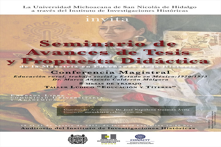 La Universidad Michoacana de San Nicolás de Hidalgo, a través del Instituto de Investigaciones Históricas (IIH), invita a la comunidad universitaria y académica, al Seminario de Avances de Tesis y Propuestas Didácticas de la MaestrÃa en Enseñanza de la Historia.