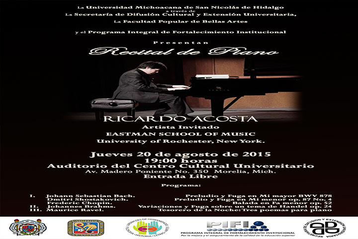 La Universidad Michoacana de San Nicolás de Hidalgo a través de La SecretarÃa de Difusión Cultural y Extensión Universitaria, La Facultad Popular de Bellas Artes (FPBA) y el Programa Integral de Fortalecimiento Institucional en el marco de las actividades de Inicio del Ciclo Escolar 2015-2016, presentan un recital de piano a cargo de Ricardo Acosta, artista invitado de la Eastman School of Music, de la Universidad de Rochester, en Nueva ... Ver más...