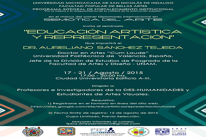 La Universidad Michoacana de San Nicolás de Hidalgo, a través de la Facultad Popular de Bellas Artes, dentro del Programa Integral de Fortalecimiento Institucional, en el marco del primer Diplomado Internacional en Semiótica del Arte, abrió la convocatoria al Seminario denominado "Educación Artística y Representación".