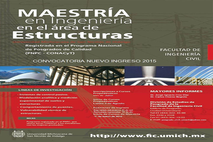 La Facultad de Ingeniería Civil, a través de su División de Estudios de Posgrado, de la Universidad Michoacana de San Nicolás de Hidalgo (UMSNH), se encuentra lista para recibir las solicitudes de ingreso de las personas que cuenten con estudios de licenciatura en Ingeniería Civil o área afín, interesadas en cursar el programa de Maestría en Ingeniería en el Área de Estructuras.
