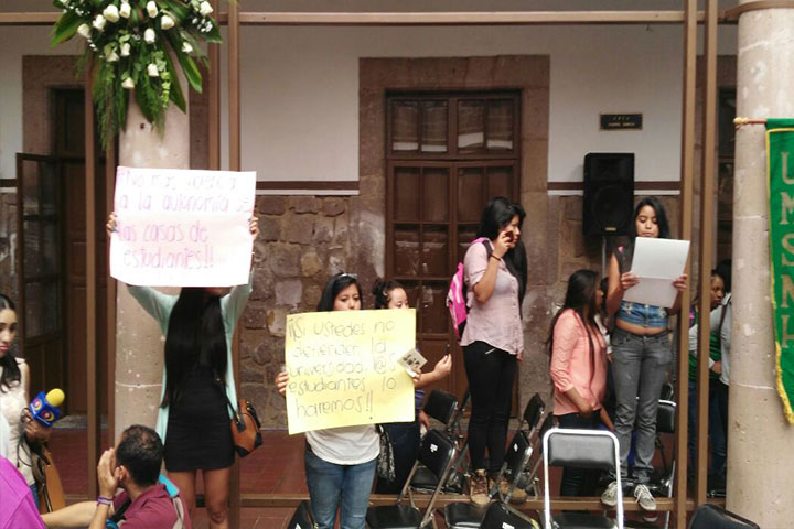 NOTICIAS 08/05/2015Protestan para denunciar expulsión de 20 jovencitas de 2 casas de estudiantes Mujeres estudiantes denunciaron la expulsión de por lo menos 20 de sus compañeras de las casas del Estudiante "Rosas Luxemburgo" y "América Libre", esto por parte de personas infiltradas que a decir de ellas, son manejadas por Dolores Govea Paz, jefe del Departamento de Asuntos Estudiantiles de la Universidad Michoacana de San Nicolás de Hidalgo (UMSNH).