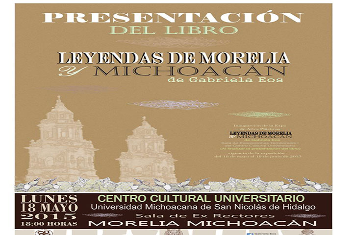 "Leyendas de Morelia y Michoacán", es el título del libro de la escritora nicolaita Gabriela Eos, que se presentará el próximo lunes 18 de mayo, a las 6 de la tarde, en la Sala de Ex rectores del Centro Cultural Universitario (CCU), evento organizado por la Secretaría de Difusión Cultural y Extensión Universitaria de la Universidad Michoacana de San Nicolás de Hidalgo.