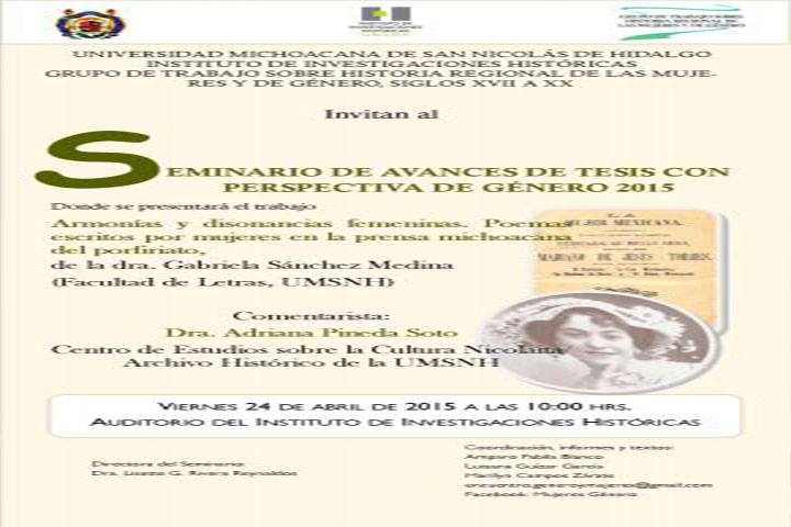 Dentro de las actividades que se llevan a cabo con motivo del Seminario Avances de Tesis e Investigaciones con Perspectiva de Género 2015, en el Instituto de Investigaciones Históricas (IIH), de la Universidad Michoacana de San Nicolás de Hidalgo (UMSNH), esta semana tendrá lugar la presentación del trabajo "Armonías y disonancias femeninas. Poemas escritos por mujeres en la prensa michoacana del Porfiriato", por la doctora Gabriela Sán... Ver más...