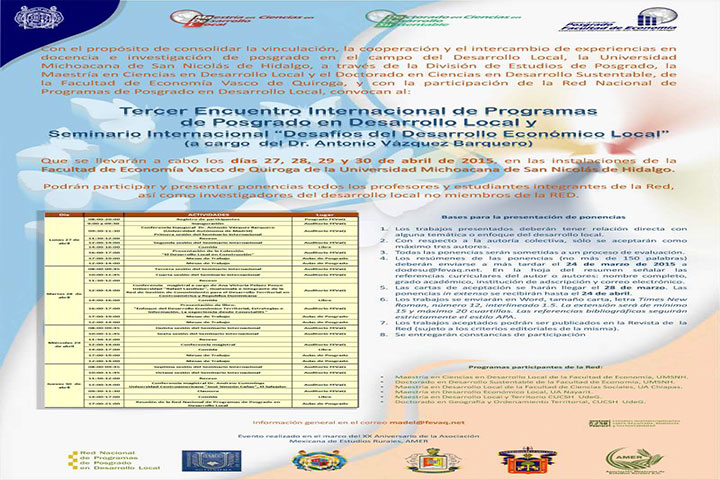 La Universidad Michoacana de San Nicolás de Hidalgo, a través de la División de Estudios de Posgrado de la Facultad de Economía Vasco de Quiroga, se honra en auspiciar la celebración del Tercer Encuentro de la Red Nacional de Programas de Posgrado en Desarrollo Local, a realizarse del lunes 27 al jueves 30 de abril de 2015, contando con la participación activa de seis programas de posgrado provenientes de cuatro instituciones del país: l... Ver más...