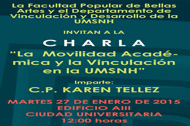 NOTICIAS 24/01/2015Divulgará la UMSNH las ofertas sobre movilidad estudiantilCon la finalidad de elevar la calidad educativa y propiciar la experiencia de otras culturas y costumbres sociales, el próximo martes en la Facultad Popular de Bellas Artes (FPBA), la Secretaría Académica a través del Departamento de Vinculación y Desarrollo, impartirá una charla para informar a la comunidad de la oferta de la Universidad Michoacana de San Nicolás de Hidalgo (UMSNH), sobre las ofertas de movilidad disponible para profesore... Ver más...