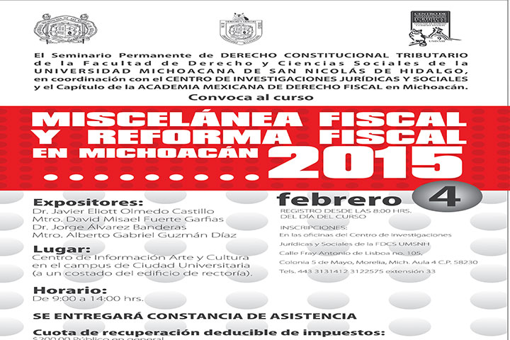 Para dar a conocer los aspectos novedosos y lo más relevante de la Miscelánea Fiscal 2015, así como proporcionar los elementos necesarios para analizar y comprender los cambios legislativos en la materia, el seminario permanente de Derecho Constitucional Tributario de la Facultad de Derecho y Ciencias Sociales, de la Universidad Michoacana de San Nicolás de Hidalgo (UMSNH), en coordinación con el Centro de Investigaciones Jurídicas y Soci... Ver más...