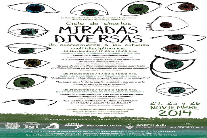 NOTICIAS 19/11/2014Ciclo de charlas Miradas Diversas, un acercamiento a los estudios multidisciplinarios Durante los días 24, 25 y 26 de Noviembre en las facultades de Historia y Filosofía, se realizará el Ciclo de Charlas Miradas diversas, un acercamiento a los estudios multidisciplinarios, con los objetivos de crear un espacio de diálogo y encuentro entre la pluralidad de ideas en torno a los estudios multidisciplinarios desde las ciencias sociales y las humanidades, así como de establecer puentes personales e institucionales para contribuir... Ver más...