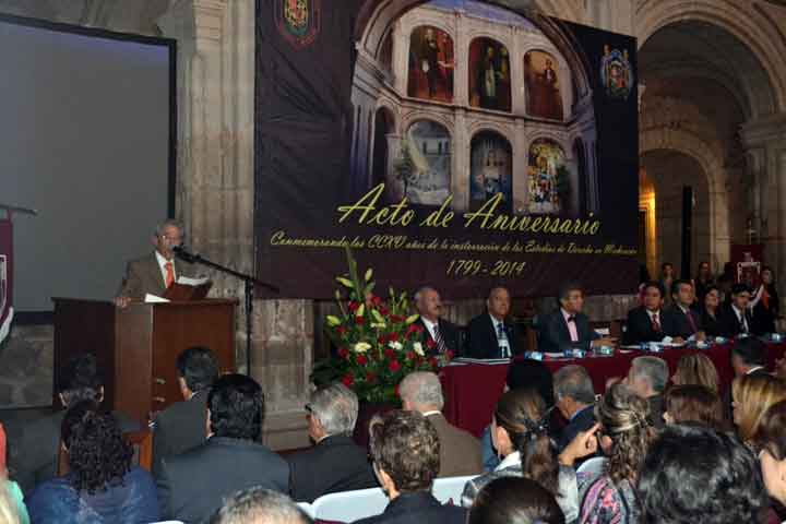 NOTICIAS 13/05/2014Conmemoran los CCXV años de la Instauración de los Estudios de Derecho El Derecho es fundamental para dirimir las diferencias de una sociedad compleja como la actual, en donde las minorías son las mayorías, así lo manifestó el rector de la Universidad Michoacana de San Nicolás de Hidalgo (UMSNH), Salvador Jara Guerrero, durante e la conmemoración de los CCXV años de la Instauración de los Estudios de Derecho en Michoacán.