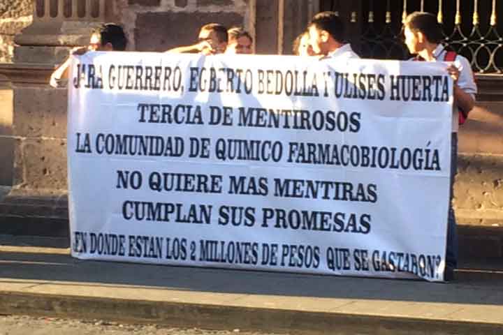 Los jóvenes manifestantes portan lonas con mensajes en las que hacen patente su rechazo a las tarifas dentro de la máxima casa de estudios en la entidad e incluso cuestionan autoridades nicolaitas sobre el destino de recurso.