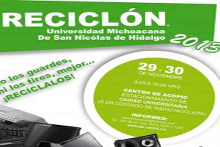 NOTICIAS 29/11/2013Inicia segundo Reciclón de Residuos Electrónicos y EléctricosCon la meta de recolectar más de 12 toneladas de residuos, este viernes arrancó el segundo Reciclón organizado por la Universidad Michoacana de San Nicolás de Hidalgo, con el objetivo de que la sociedad en general pueda llevar aparatos eléctricos que ya no sirvan al estacionamiento de Ciudad Universitaria a un costado de Radio Nicolaita.
