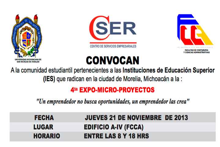 Para incentivar la creatividad de los estudiantes para desarrollar una actitud emprendedora y al tiempo dar a conocer los proyectos de los jóvenes emprendedores michoacanos mediante la exposición de sus productos y servicios, la Facultad de Contaduría y Ciencias Administrativas de l Universidad Michoacana de San Nicolás de Hidalgo invita a la comunidad estudiantil de las instituciones de educación superior de Morelia a la 4ta Expo - Micro... Ver más...